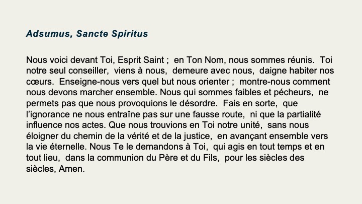 Nous voici devant Toi, Esprit Saint; en Ton Nom, nous sommes réunis. Toi notre seul conseiller, viens à nous, demeure avec nous, daigne habiter nos cœurs. Enseigne-nous vers quel but nous orienter; montre-nous comment nous devons marcher ensemble. Nous qui sommes faibles et pécheurs, ne permets pas que nous provoquions le désordre. Fais en sorte, que l’ignorance ne nous entraîne pas sur une fausse route, ni que la partialité influence nos actes. Que nous trouvions en Toi notre unité, sans nous éloigner du chemin de la vérité et de la justice, en avançant ensemble vers la vie éternelle. Nous Te le demandons à Toi, qui agis en tout temps et en tout lieu, dans la communion du Père et du Fils, pour les siècles des siècles, Amen.